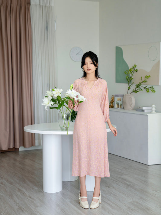 Camie Pink Marigold Pattern Midi Dress - Gu Fashion | Vietnam Fashion